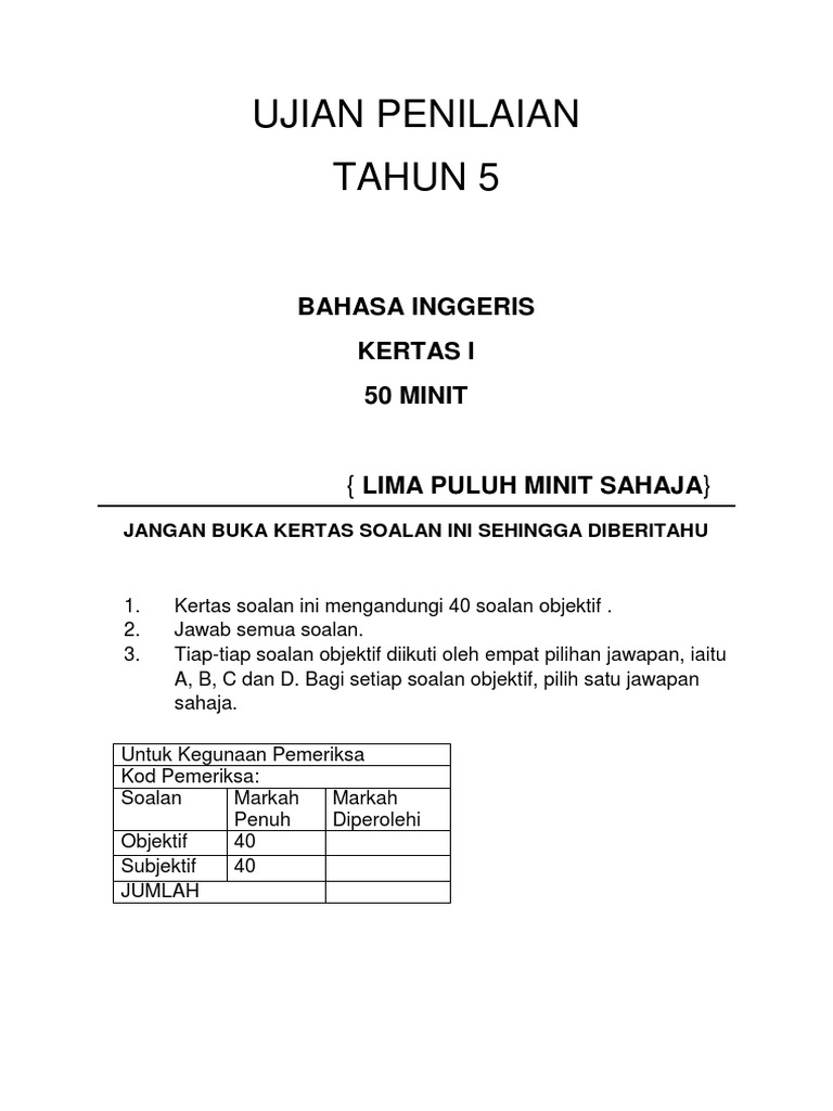 Kertas Soalan Objektif Bahasa Inggeris Tahun 5 Kssr